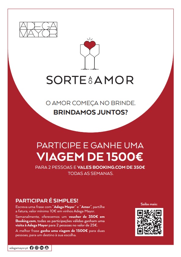 Os participantes, maiores de 18 anos, devem aceder ao website, submeter o talão de compra e escrever uma frase que inclua as palavras “Adega Mayor” e “Amor”. A frase mais inspiradora será premiada com uma viagem para duas pessoas, no valor de 1.500€ para um destino à escolha, já que o amor merece ser vivido sem fronteiras.