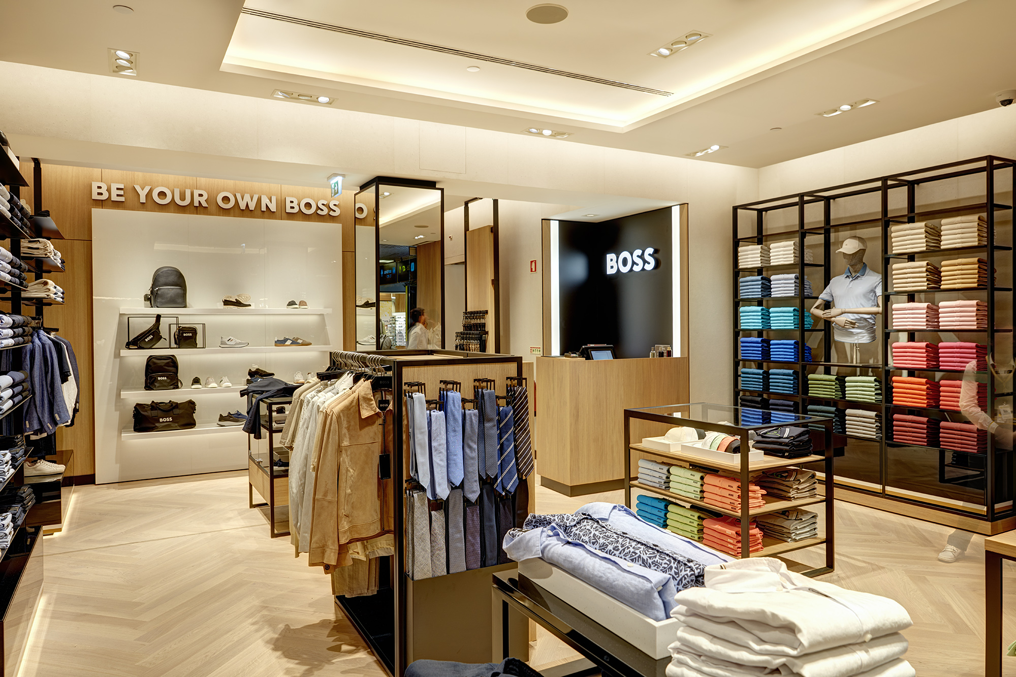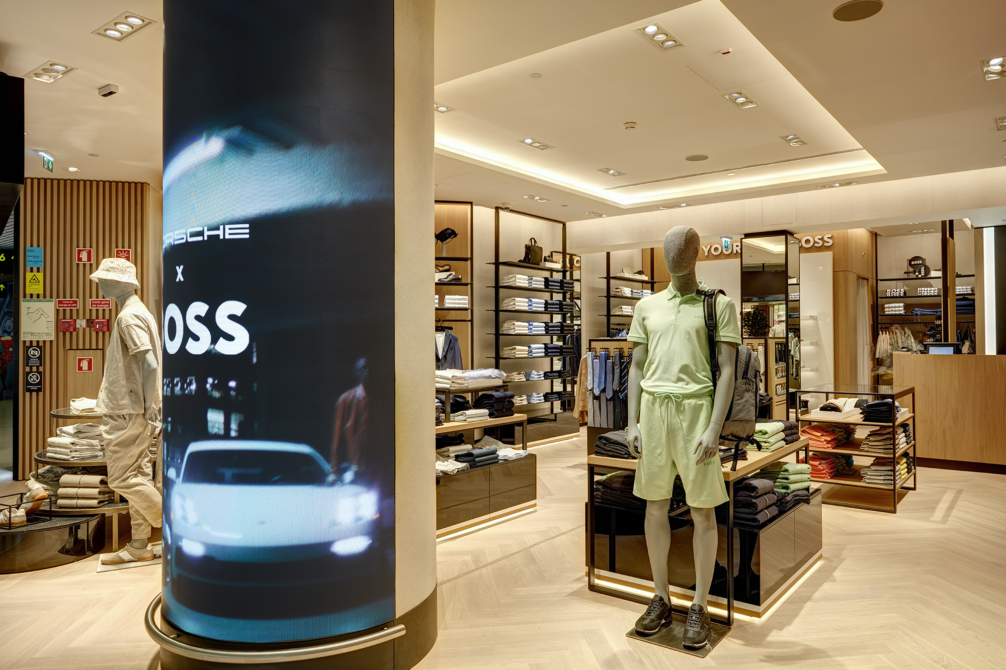 Este novo espaço é caracterizado por um design sóbrio e inovador, que inclui iluminação led, um statement da marca, para gerar visibilidade. É num ambiente agradável e acolhedor, que os clientes podem encontrar a oferta diversificada de vestuário, calçado e acessórios da BOSS.