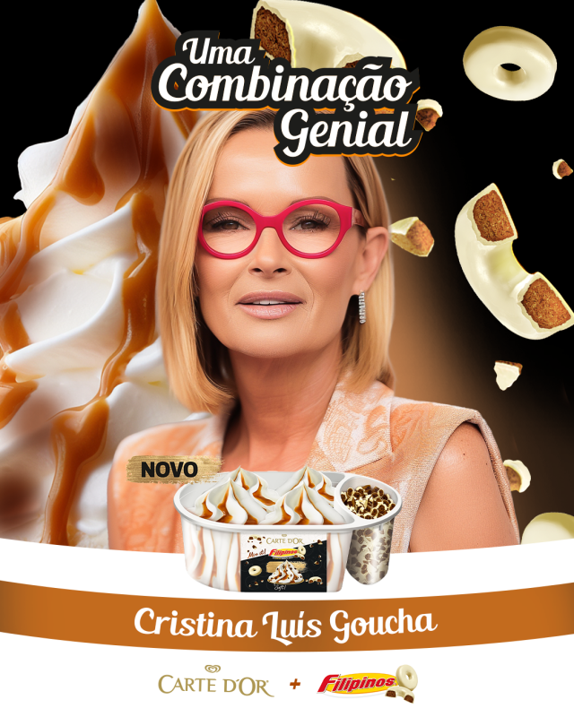 Cristina Luis Goucha e Pedro Teotónio Pereira são as estrelas da campanha.Provavelmente leu os nomes anteriores e não estranhou. Sugerimos que volte atrás e leia outra vez. É verdade, a marca Carte D’Or acaba de lançar a campanha Combinações Geniais em que, à semelhança da combinação entre Carte D’Or e Filipinos, conjuga quatro grandes personalidades da Televisão nacional para lançar o novo produto Carte D’Or Filipinos. Porque se esta é uma combinação genial entre o Gelado Carte D’Or e a Bolacha Filipinos, como seria esta genialidade entre pessoas no mundo real? Através da Inteligência Artificial, surgem assim Cristina Luis Goucha e Pedro Teotónio Pereira, combinações que juntam duas personalidades únicas, Cristina Ferreira e Manuel Luís Goucha e Pedro Teixeira e Tiago Teotónio Pereira, e formam algo incrível.