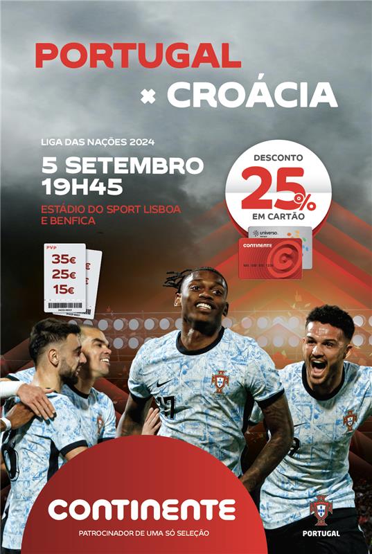 Portugal defronta a Croácia no dia 5 de setembro e a Escócia no dia 8 de setembro, ambos às 19h45. Os jogos da Seleção Nacional de Futebol para a Liga das Nações realizam-se no Estádio do Sport Lisboa e Benfica, em Lisboa, e os bilhetes com 25% de desconto em Cartão Continente já estão à venda.