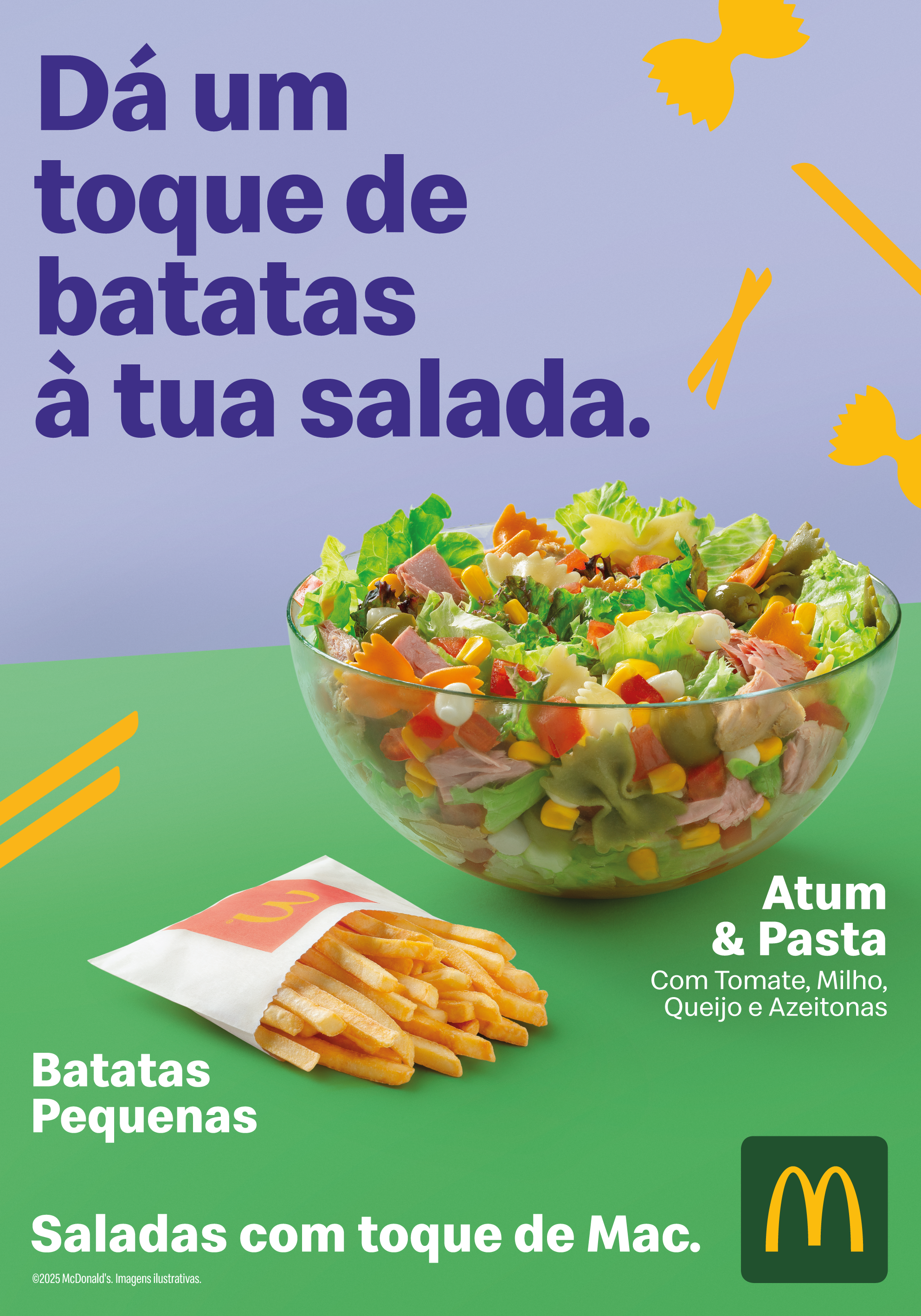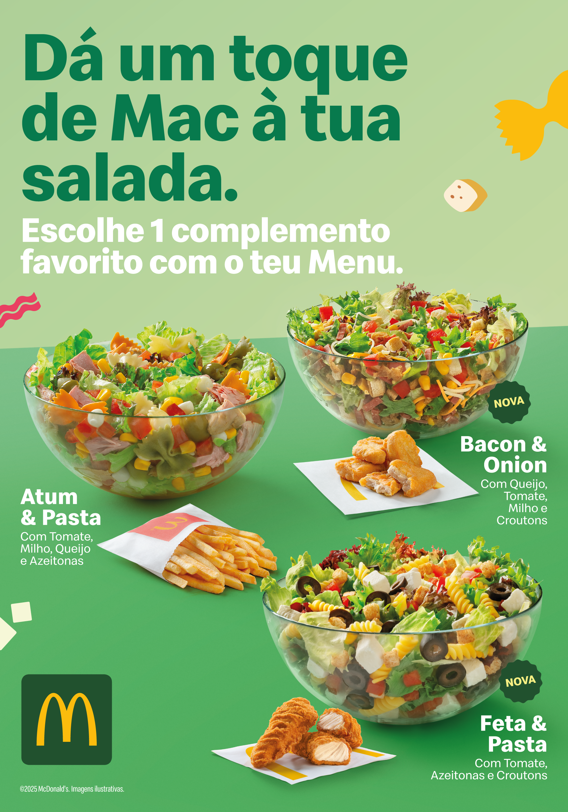 A McDonald’s Portugal apresenta duas novas receitas e volta a integrar três opções na gama de saladas, com o objetivo de renovar e diversificar a sua oferta. A partir de 15 de abril, as saladas ‘Feta & Pasta’ e ‘Bacon & Onion’ juntam-se à receita ‘Atum & Pasta’ e podem ser pedidas em McMenu, com complementos exclusivos da marca e bebida. Esta combinação pretende proporcionar uma verdadeira experiência McDonald’s, assente no conceito ‘Saladas com Toque de Mac’.