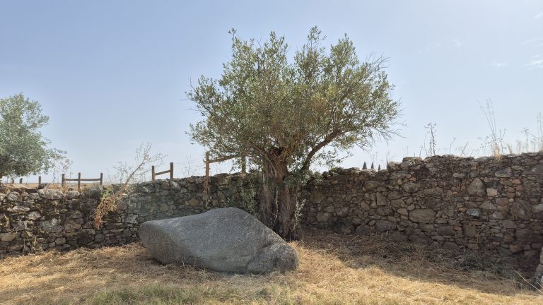 Junto ao muro da quinta, à sombra das oliveiras, repousa um grande pedregulho de granito cinzento e amarelo, com um formato peculiar, a lembrar uma soca de madeira.