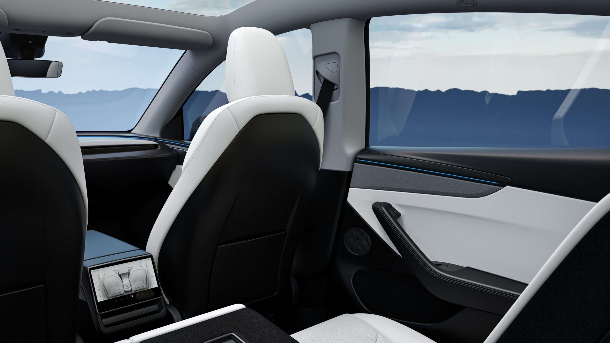 Na segunda fila surge um ecrã de 8’’ dedicado a entretenimento, jogos e controlos adicionais, com Bluetooth para emparelhamento de auscultadores — útil para viagens longas e para “silenciar” discussões no banco de trás. A terceira fila inclui duas portas USB-C, e a Tesla refere um bom espaço para a cabeça graças ao posicionamento sob o vidro traseiro.
