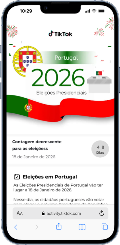 Para ajudar as pessoas a aceder facilmente a informações fidedignas sobre a votação e as eleições, lançámos o nosso Centro Eleitoral a 9 de dezembro. Este recurso dentro da app fornece detalhes essenciais sobre as eleições presidenciais em português, incluindo links para fontes credíveis que explicam onde e como votar. Destaca também datas importantes, dicas de literacia mediática do TikTok e informações adicionais sobre os candidatos. Antes do seu lançamento, o TikTok colaborou com os reguladores nacionais portugueses responsáveis por proteger a integridade do processo eleitoral para apresentar a sua abordagem. Durante o período eleitoral, os utilizadores são direcionados para o Centro Eleitoral através de sugestões de pesquisa dedicadas, marcadores em vídeos relevantes e tags em conteúdos publicados por GPPPAs.